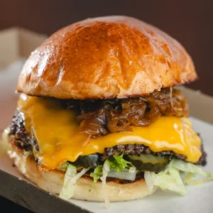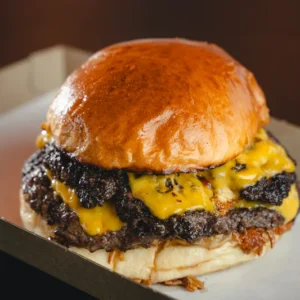 Dupla Angus marhahúspogácsa (260 g), dupla cheddar sajt, csemegeuborka, ropogós sült hagyma, ketchup, mustár