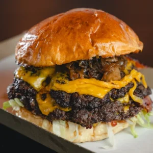 Tripla Angus marhahúspogácsa (390 g), tripla cheddar sajt, tripla bacon, jégsaláta, csemegeuborka, lilahagyma dzsem, választható házi szósz